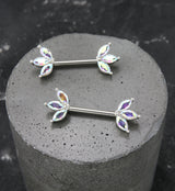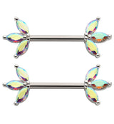 Mesmerizing nipple barbells with a triple marquise rainbow aurora cz design on either side, accented with beads. Made from 316L stainless steel. Size is 14G with a barbell length of 9/16" (14mm). Externally threaded. Intended for healed piercings. Sold in pairs (2 pcs).