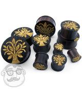 Sold in pairs (2pc) Sono wood plug Engraved filigree tree design Keep out of shower/water to preserve the gold color Each piece is unique due to the nature of the wood Single sided Length: 12mm 00G - 28mm