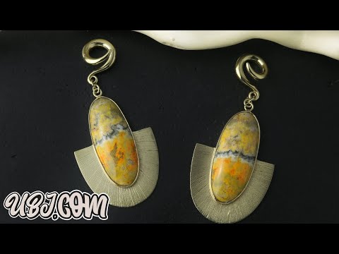 Awesome hanging ear weights made from natural bumblebee jasper stone. Each piece is unique in color and pattern. Made from brass. 6G or larger to wear. Approximately 25 grams per piece. Stone size: 46mm. Sold in pairs (2 pcs). For healed piercings.