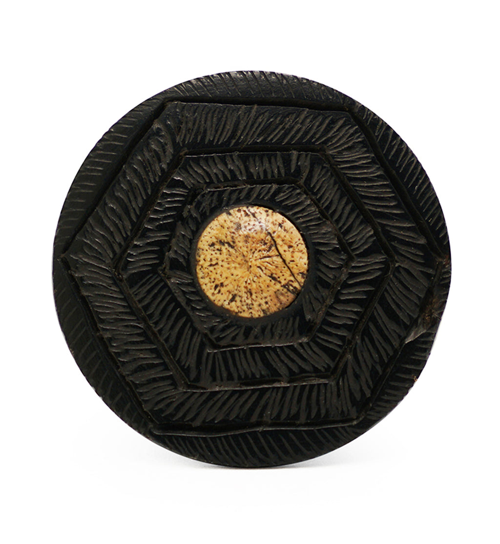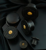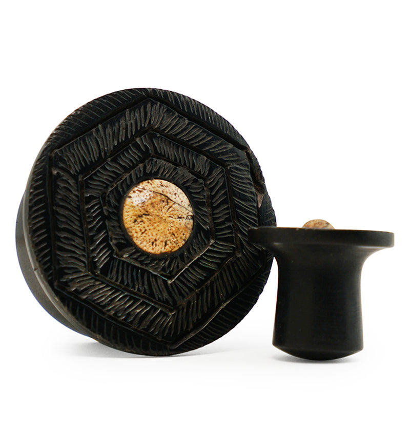 Handcrafted mayan flare tunnel plugs made from areng wood with an engraved, geometrical design with carved line texture. They have a tamarind wood inlay that measures about 9mm-10mm. Pretty pair to add to your plug collection! Each piece will be unique in color and pattern due to the nature of the wood. We will do our best to find you a complementing pair. Available in sizes 00G (10mm) - 1 & 1/2" (38mm). For healed piercings/lobes. Sold in pairs (2pcs).