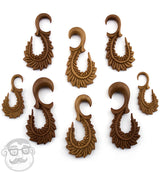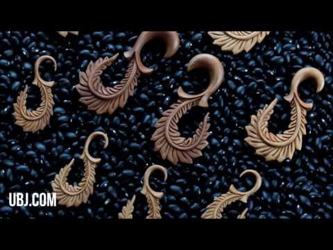 Add a touch of nature-inspired flair with these Feathered Saba Wood Hangers! Handcrafted with care, each pair features a curved feather design carved from rich saba wood. Also available as fake gauges with a comfortable ASTM F-136 titanium push pin. These hangers are meant for healed lobes - do not use for ear stretching. Available in sizes from 8G (3.2mm) to 1/2" (12mm), these unique earrings bring detailed artistry and lightweight comfort to your look. Just remember to keep them away from direct sunlight and moisture to preserve their beauty!