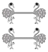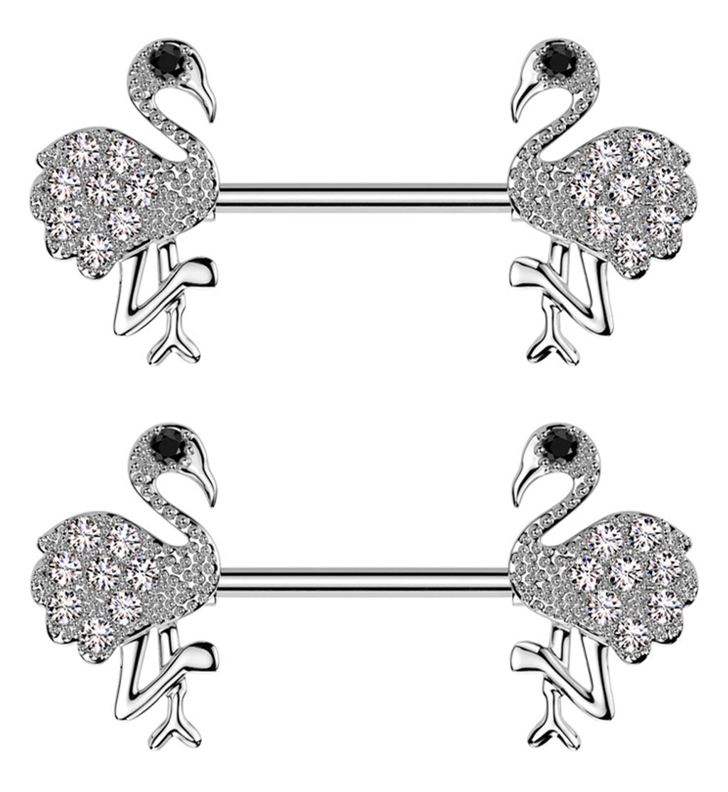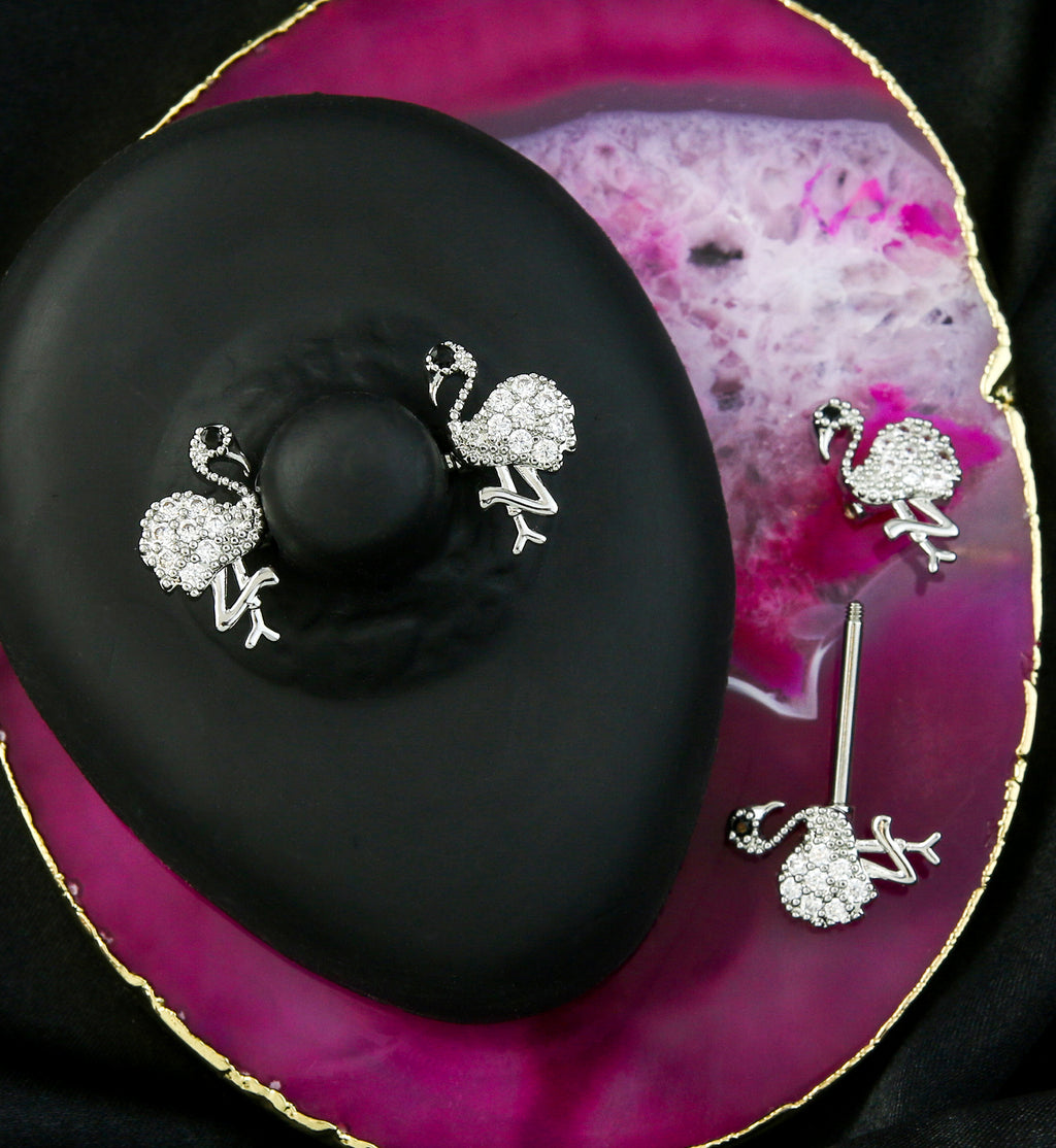 Made from 316L stainless steel, these nipple barbells feature a fun beaded design on the flamingo, filled with clear cz gems. It has a black cz gem for an eye.The externally threaded barbells have a 14G size and a comfortable 9/16" (14mm) wearable area for healed piercings. The wearable area is made from 316L stainless steel. The flamingo design is made out of brass. Note that brass is not meant for long term wear and may oxidize under extreme moisture conditions. Flamingo design measures about 16mm x 10mm. Item is sold in pairs (2 pc). For healed piercings.