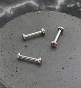 Elegant and simple labret piece for your piercing! Internally threaded labret piece that has a pink, flat, bezel cz gem on top. Made from ASTM F-136 titanium. Size is 16G. Length is 5/16" (8mm). Both have a 3mm sized gem top. Sold individually (1pc).