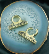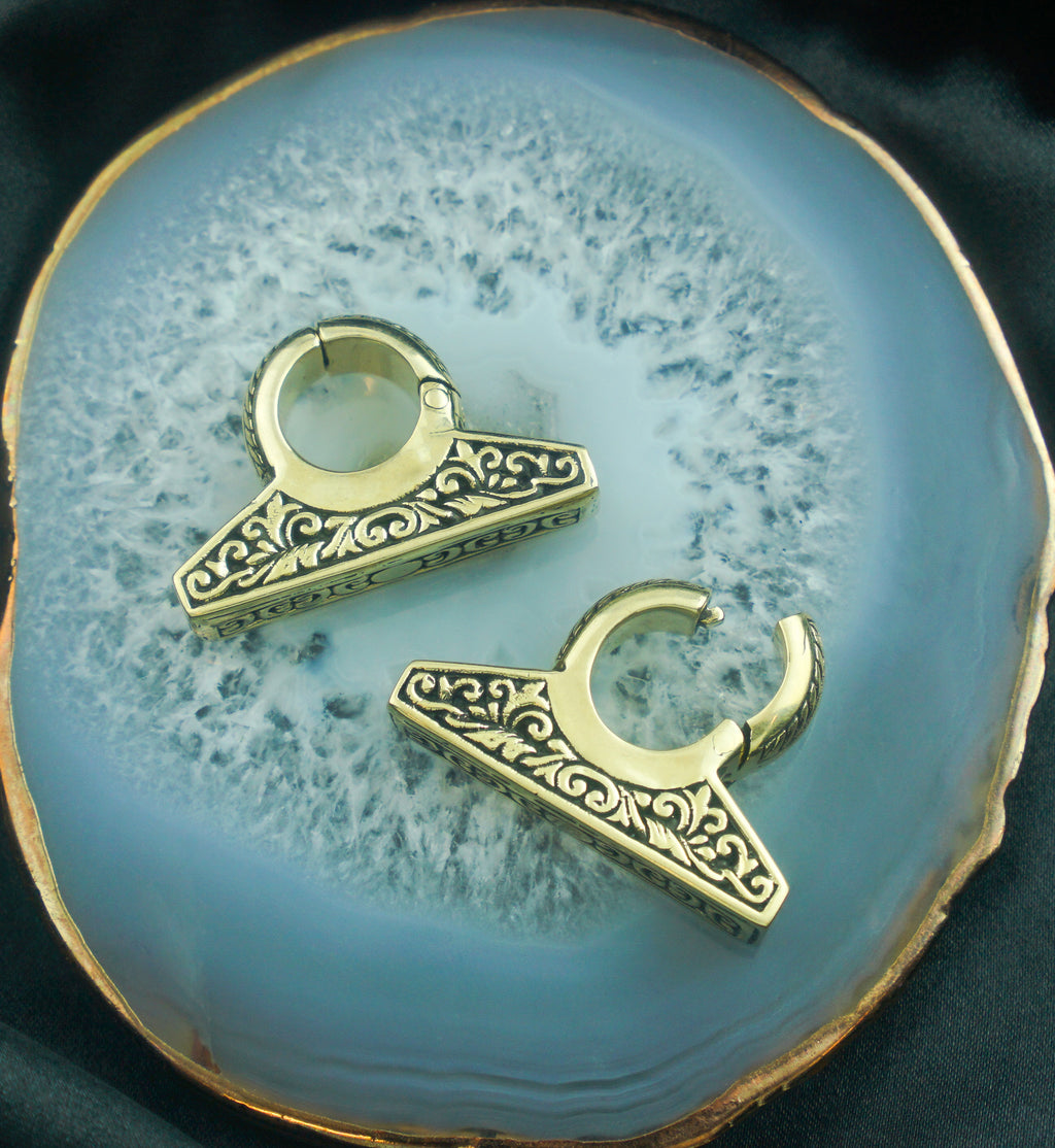 Hinged ear weights that are made from yellow brass and are size 0G (8mm) so must be 0G or bigger to wear. They have a trapezoid-shaped design that is ornately decorated. Brass is not meant for long term wear, it may oxidize under extreme moisture conditions. These ear weights have a hinged design that opens and clicks closed for an effortless fit. Length is about 22mm and the width is about 34mm. Weight is about 14 grams each. For healed lobes. Sold in pairs (2pcs).