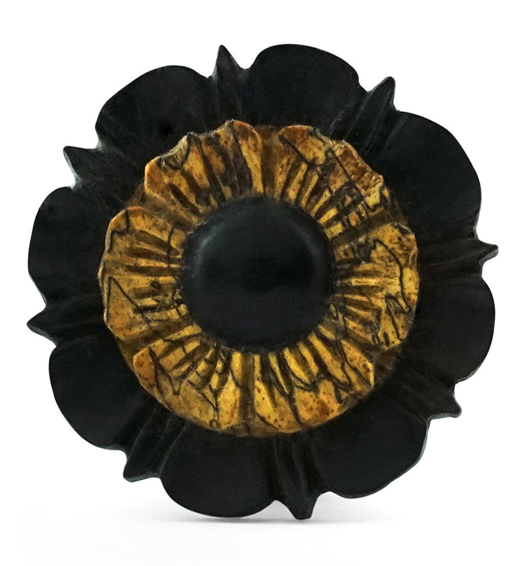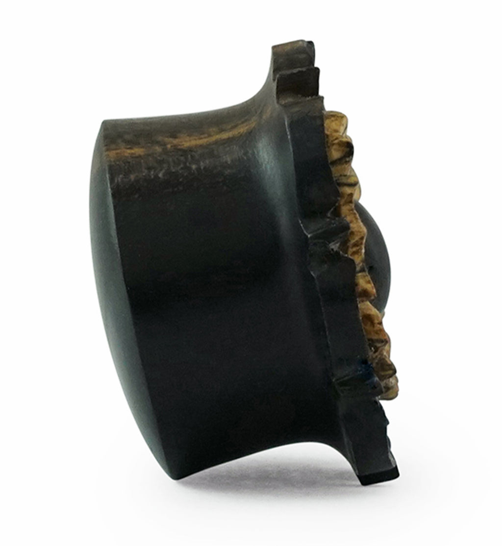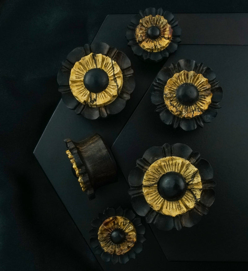 Beautiful mayan flare tunnel plugs made from areng wood with a carved flower design. There is an inner ring made of tamarind wood that surrounds an inlay made of areng wood. Inlay size ranges from about 5mm to 16mm depending on size of plug. Natural, wooden pair to add to your plug collection! Each piece will be unique in color and pattern due to the nature of the wood. We will do our best to find you a matching or complementing pair. Available in sizes 00G (10mm) - 1 & 1/2" (38mm). For healed piercings/lobes. Sold in pairs (2pcs).