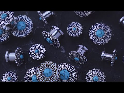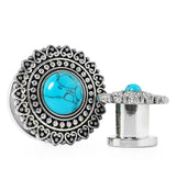 Screw back tunnels plugs with an ornamental design around a synthetic howlite turquoise stone. Made from 316L stainless steel. Available sizes: 2G (6mm), 0G (8mm), 00G (10mm), 7/16" (11mm), 1/2" (12mm), 9/16" (14mm), 5/8" (16mm). Full Length: 12mm X Wearable area: 8mm. Sold in pairs (2pcs).