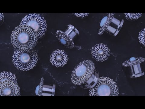Screw back tunnels plugs with an ornamental design around a shining, synthetic white opal gem. Made from 316L stainless steel. Available sizes: 2G (6mm), 0G (8mm), 00G (10mm), 7/16" (11mm), 1/2" (12mm), 9/16" (14mm), 5/8" (16mm). Full Length: 12mm X Wearable area: 8mm. Sold in pairs (2pcs).