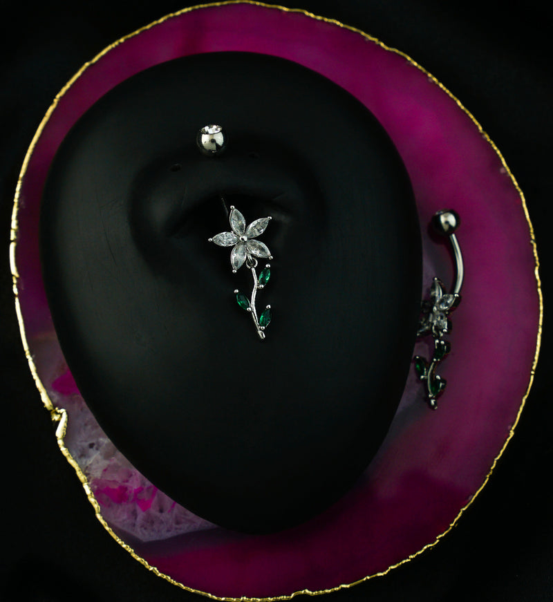 This belly ring has a flower design that has a five marquise gem shape with a stem and leaves. The flower is stationary and is made from marquise, clear cz gems and the leaves/stem are dangling with marquise, emerald green cz gems. It has a length of 7/16" (11mm) and a gauge size of 14G. It features a 5mm externally threaded cz top and the bottom flower design measures about 10mm. The dangle stem/leaves design measures about 12mm x 6mm. For healed piercings. Sold individually (1 pc).