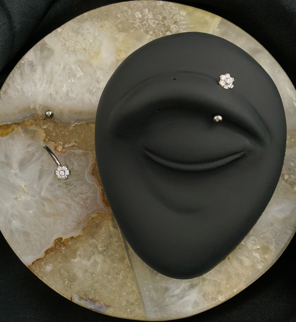 Internally threaded curved barbell made from durable ASTM F-136 titanium and a sparkling, flower design that is filled with clear cz gems. Size 16G with a length of 5/16" (8mm). The flower end is fixed and measures 5mm and the ball end is internally threaded and measures about 3mm. Sold individually. For healed piercings.