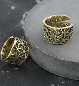 This Flower Of Life Brass Ring is a handcrafted, adjustable accessory made from polished brass. Specially designed to fit all sizes and nickel, lead, and cadmium free. The band stands at 14mm high, while its adjustable nature ensures lasting use and convenience. This ring should be removed in cases of extreme moisture as brass may oxidize. Sold individually (1pc).