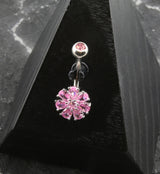This navel piercing is crafted with a 316L stainless steel 14G barbell with a 5mm pink cz gem top and a beautiful flower shaped bottom made out of round and teardrop pink cz gems. The design measures at about 11mm x 11mm. Size is 14G with a 7/16" (11mm) barbell. Externally threaded, this navel barbell is designed for healed piercings. Sold individually (1pc).