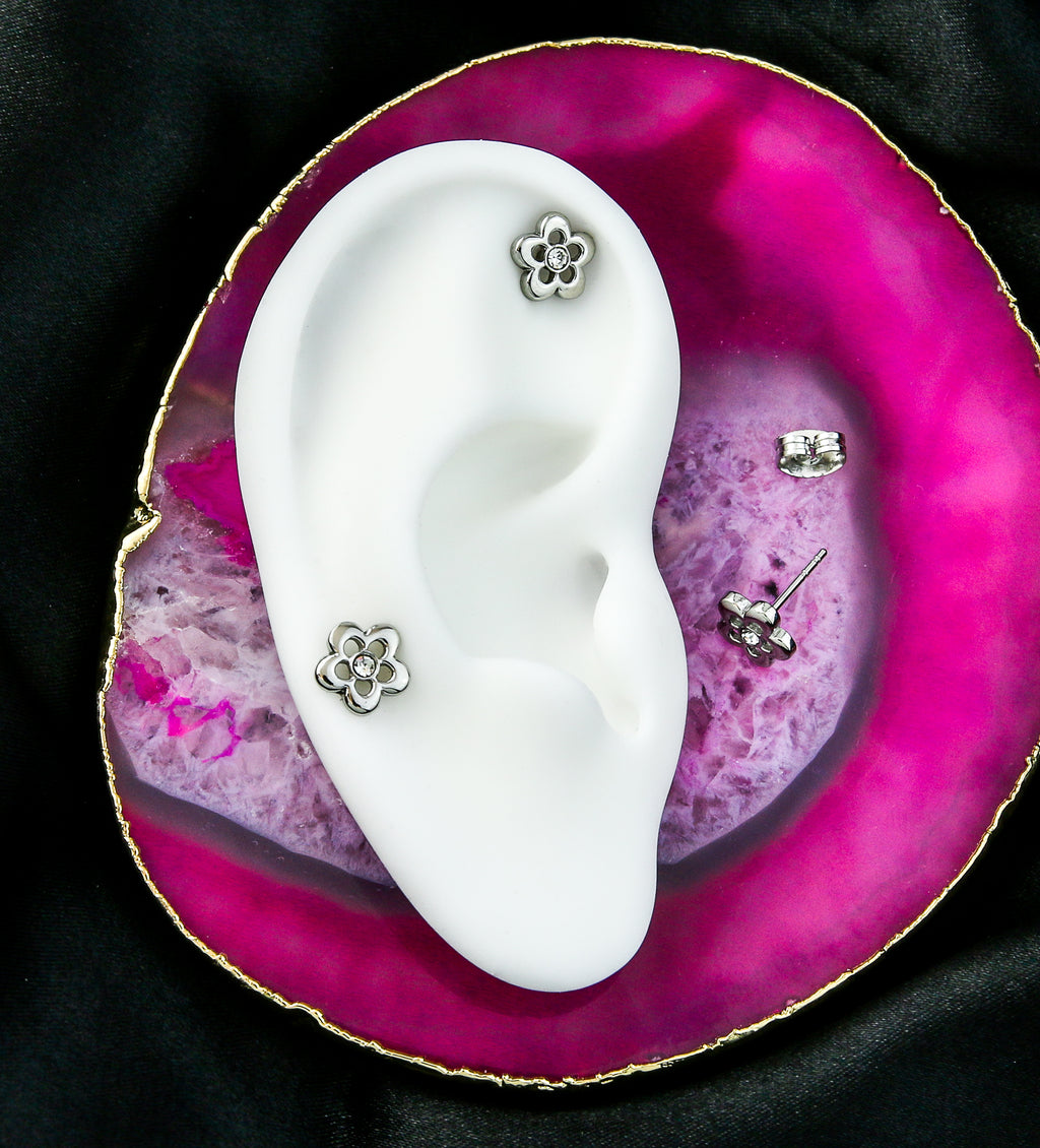 Stud earrings with a flower outline design on the top that has a small, 1.5mm clear cz gem in the center. Made with 316L stainless steel. Size is 20G with a length of about 1/4" (6mm). Each piece has a stud design with a secure butterfly back. Top design measures about 8mm. Sold in pairs.