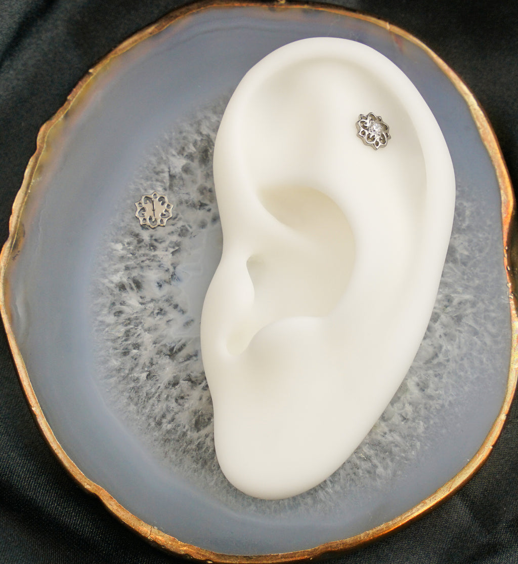 This threadless top piece has a whimsical flower design with a centered, 2mm clear cz gem. Pin size is 25G so it fits most threadless tops. The top size is about 7mm. It is made from strong ASTM F-136 titanium. Effortless to put in and remove. Sold Individually - top only.