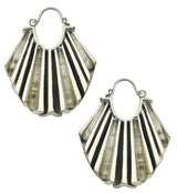 Silver brass hangers/earrings with an oval shape and a folded, ray design. Size is 18G with measurements of 48mm x 34mm. Each earring weighs about 27 grams. Made from white brass with a ASTM F-136 titanium clasp. Sold in pairs (2 pieces).