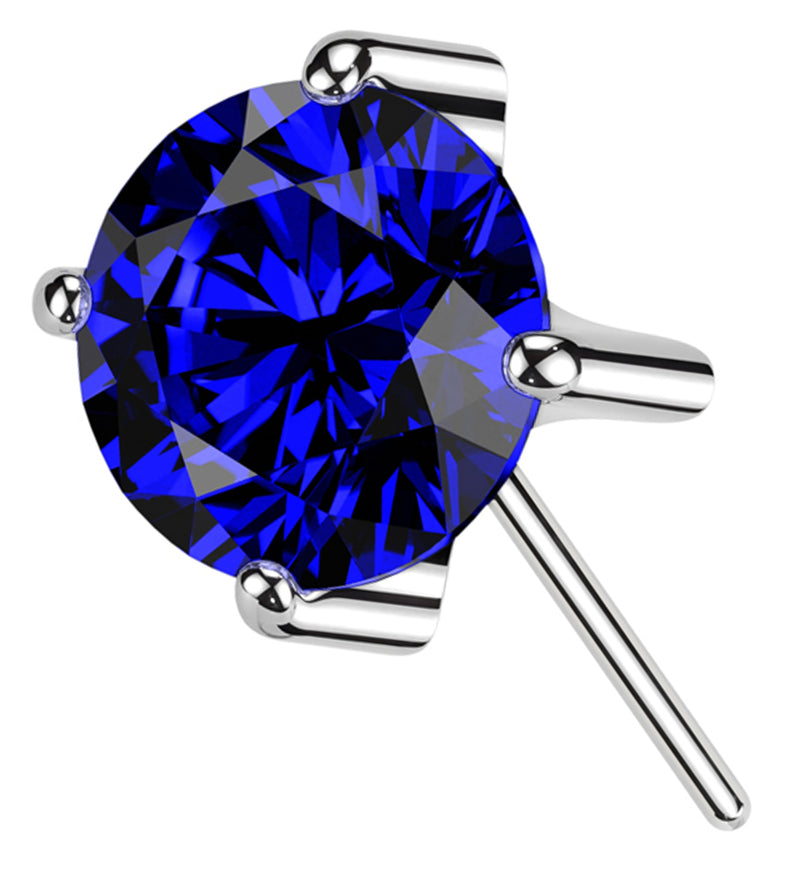 Deep blue titanium threadless top which features a forward-facing, prong-set, blue cz gem. Available in three gem sizes: 3mm, 4mm, and 5mm. This top is made from strong ASTM F-136 titanium and fits most threadless posts. Pin size is 25G. Sold individually (1pc - top only).