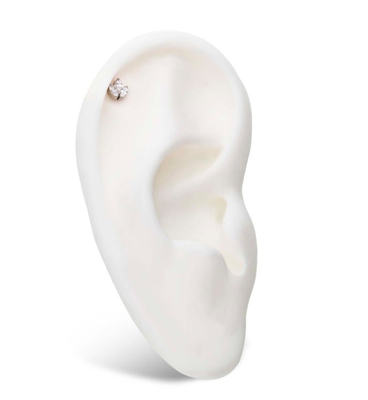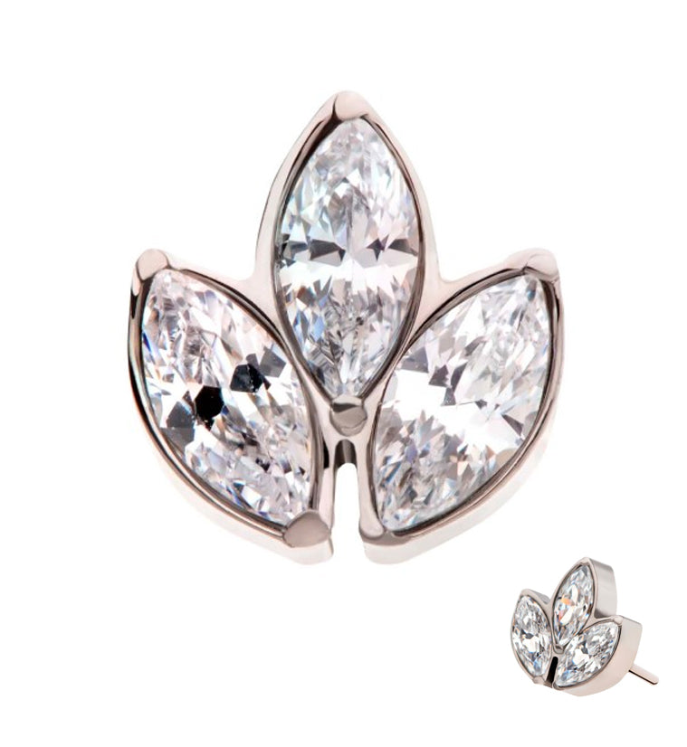 Shining threadless top piece that has a triple marquise cubic zirconia gem design. Made from ASTM F-136 titanium. Measures about 5mm x 5mm. Fits most threadless posts. Sold individually (top piece only).