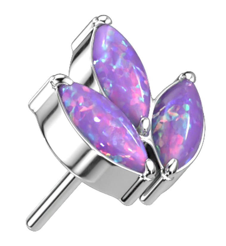 Opalite threadless top piece that has a triple marquise synthetic purple opal gem design. Made from ASTM F-136 titanium. Measures about 5mm x 5mm. Fits most threadless posts. Sold individually (top piece only).
