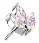 Colorful threadless top piece that has a triple marquise rainbow aurora cubic zirconia gem design. Made from ASTM F-136 titanium. Measures about 5mm x 5mm. Fits most threadless posts. Sold individually (top piece only).
