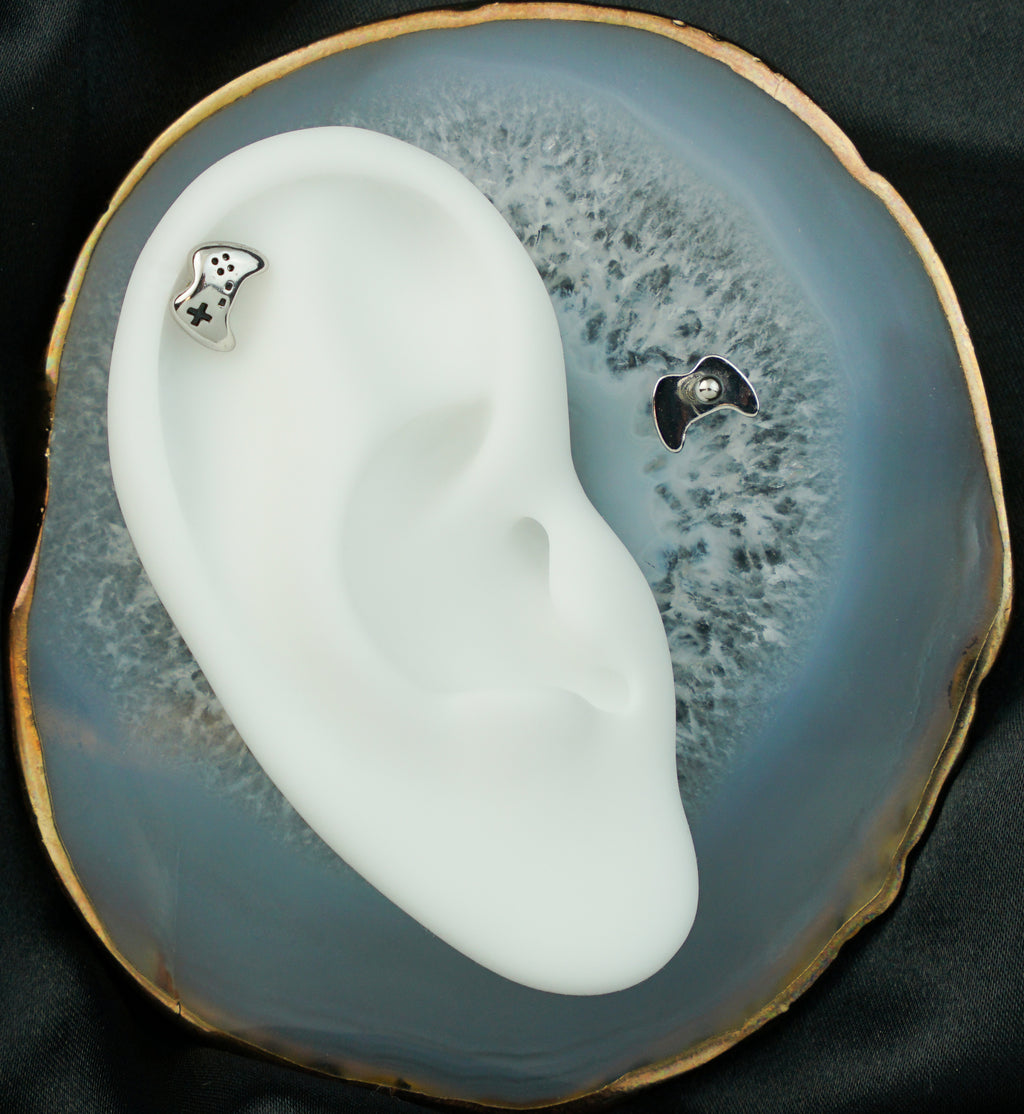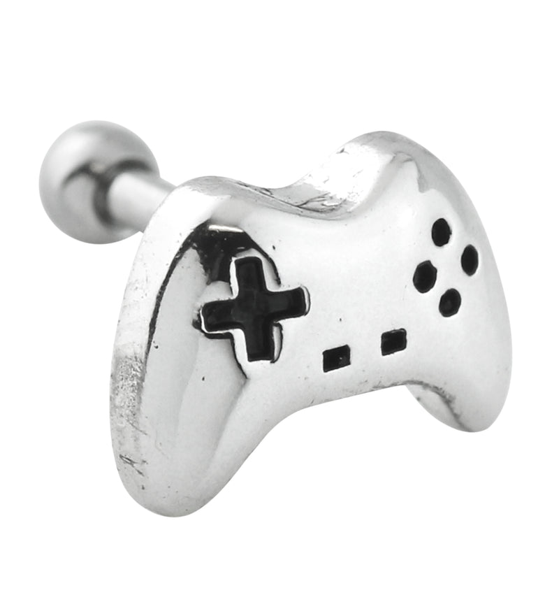 Unique stainless steel cartilage/tragus barbell with a video game controller design on top. It is made from 316L stainless steel and is externally threaded. Fun option for your cartilage piercings! Size is 16G with a bar length of 1/4" (6mm) with a 2.5mm externally threaded ball. Top size is 9mm x 6mm. Sold individually. For healed piercings.