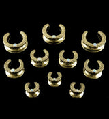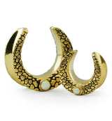 Stainless steel saddles with a scaly design on the front and accented with a synthetic white opal gem. Made from gold pvd on 316L stainless steel. 8mm wearable area. Can be worn with ear weights to evenly distribute weight. Designed to support stretched ears wearing heavy ear weights/earrings. Sold in pairs (pcs).