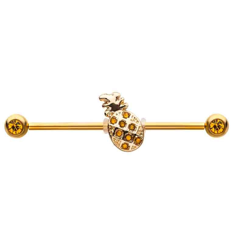 Serve tropical realness with our gold pineapple industrial barbell! The 14g straight barbell features 316L stainless steel construction with gold PVD coating, 1 ½” barbell length and external threading for easy wear. Yellow cubic zirconia details and fanciful sculpting offer serious summer vibes! Intended for healed piercings only.