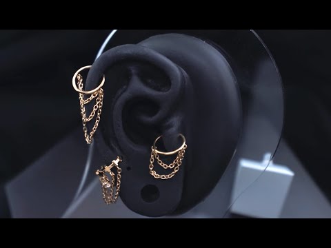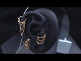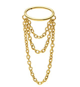 Hinged segment ring made from gold pvd on 316L stainless steel with a 18G hoop design that is accented with a triple dangle chain that is in the back of the hoop. Size is 18G with an inner diameter size of 3/8" (10mm). The hinged design makes this piece easy to insert and remove. Sold individually (1pc).