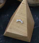 Gorgeous threadless top piece that has a tiara or crown-like design and is filled with clear, marquise cubic zirconia gems. Made from gold pvd on ASTM F-136 titanium. Measures about 13.3mm x 7mm. Fits most threadless posts. Sold individually (top piece only).