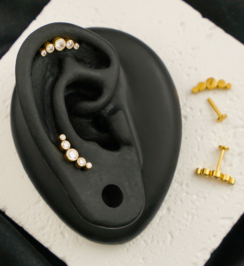 Made from gold pvd on ASTM F-136 titanium, this titanium threadless labret has an arched shape on top made up of bezel-set, clear cz gems. The arched design measures around 13mm x 5mm. It is made from gold pvd on ASTM F-136 titanium and has a 25G pin and a 4mm flat back. Sold individually, it is available in sizes 18G or 16G with a 5/16" (8mm) wearable length. Golden labret piece for cartilage piercings!