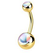 Classic gold colored belly ring with beautiful, iridescent, aura inlays on top and bottom. The 316L stainless steel barbell is 14G with a 3/8" (10mm) length. Externally threaded. For healed piercings.
