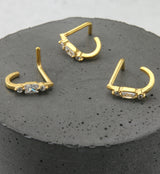 Beautiful piece for your nose piercing! This curved nose ring is filled with clear cz gems in both a round and marquise shape. Made from gold pvd on 316L stainless steel. Size is 18G. Length is 5/16" (8mm). Sold individually (1 pc).