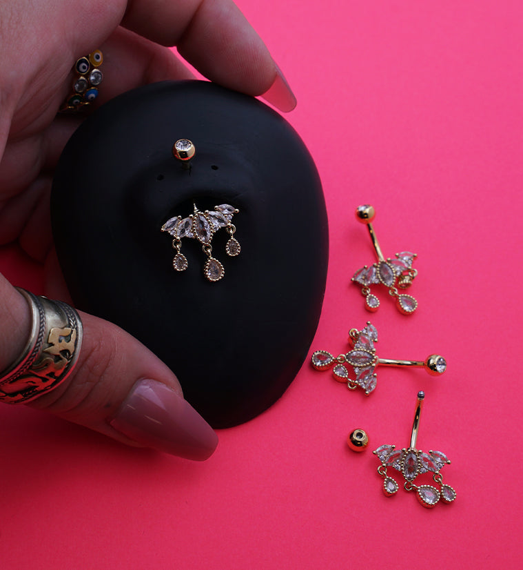 This Beaded Chaplet Dangle Teardrop CZ Belly Button Ring is ideal for healed navel piercings. Crafted from gold pvd on surgical 316L stainless steel, this single piece features a 14 gauge barbell with a 7/16" (11mm) barbell with a cluster of clear cz gems. Top gem size is 5mm and the bottom design is about 16mm x 16mm.