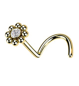 Golden nose screw ring with beaded floral design around a clear cz gem. It has a 1/4" (6mm) length screw ring design. Gold PVD on 316L stainless steel. Size: 20G. Easy to insert and take out. Sold individually. For healed piercings.