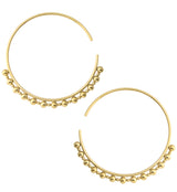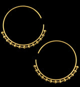 Lightweight earrings/hangers with a beaded hoop design. Size is 12G (2mm). Measures at 70mm x 65mm. Weight is about 13 grams each. NOTE: these are handmade so size and weight is approximate. Made from gold pvd on 316L stainless steel. Sold in pairs (2pc). For healed piercings/lobes.