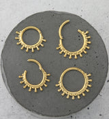 Hinged segment ring made from gold pvd on 316L stainless steel with a round shape and beaded design that looks like sunrays. Size is 16G. Choose your inner diameter size: 5/16" (8mm), 3/8" (10mm). The hinged design makes this piece easy to insert and remove. Sold individually (1pc). For healed piercings.