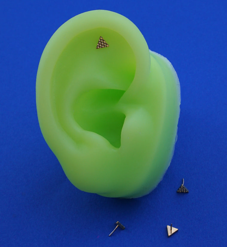 This titanium top is sold individually and made from the highest quality gold pvd on ASTM F-136 titanium. It features a beaded triangle design, measuring 4mm x 4mm x 4mm in size and designed to fit most threadless posts with a 25G pin. Enjoy the enhanced durability of titanium while showing off your style.