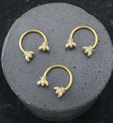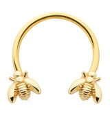Golden externally threaded circular barbell with a bee shape on either side. Size 16G with an inner diameter of 3/8" (10mm). Cute piece to add to your jewelry collection! Made from gold pvd on 316L stainless steel. Externally threaded. Sold individually (1pc).