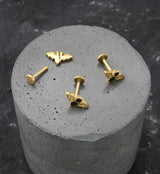 Threadless labret piece made from gold pvd on ASTM F136 titanium a bat shape. Made from black enamel and a hammered wing design. 2.5mm flat back. Choose your gauge size: 18G, 16G. Length is 5/16" (8mm). Sold individually (1 piece).