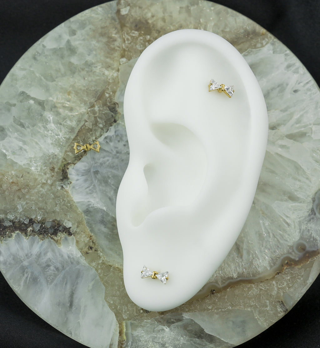 Threadless top piece that has a bowtie design that has two, triangle clear cz gems. Made from gold pvd on ASTM F-136 titanium. Measures 7mm x 5mm. Fits most threadless posts as it has a 25G pin. Fun top piece for your cartilage or tragus piercing! Sold individually.