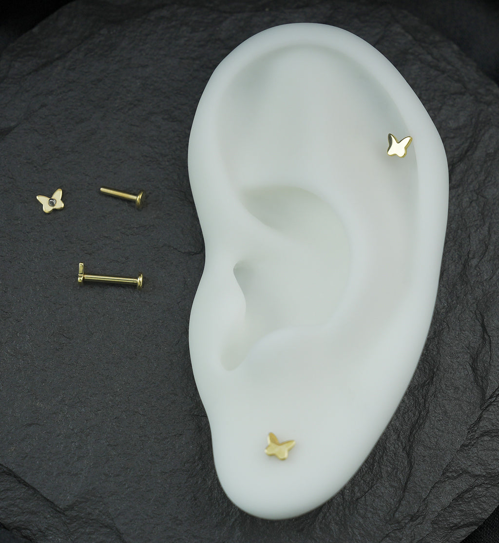 Golden, internally threaded labret that has a cute, butterfly design that has soft-rounded edges. Size is 16G and you can pick from two wearable lengths: 1/4" (6mm) or 5/16" (8mm). The top size is about 4mm with a 3mm flat disk back. It is created from gold pvd ASTM F-136 titanium. Sold Individually.