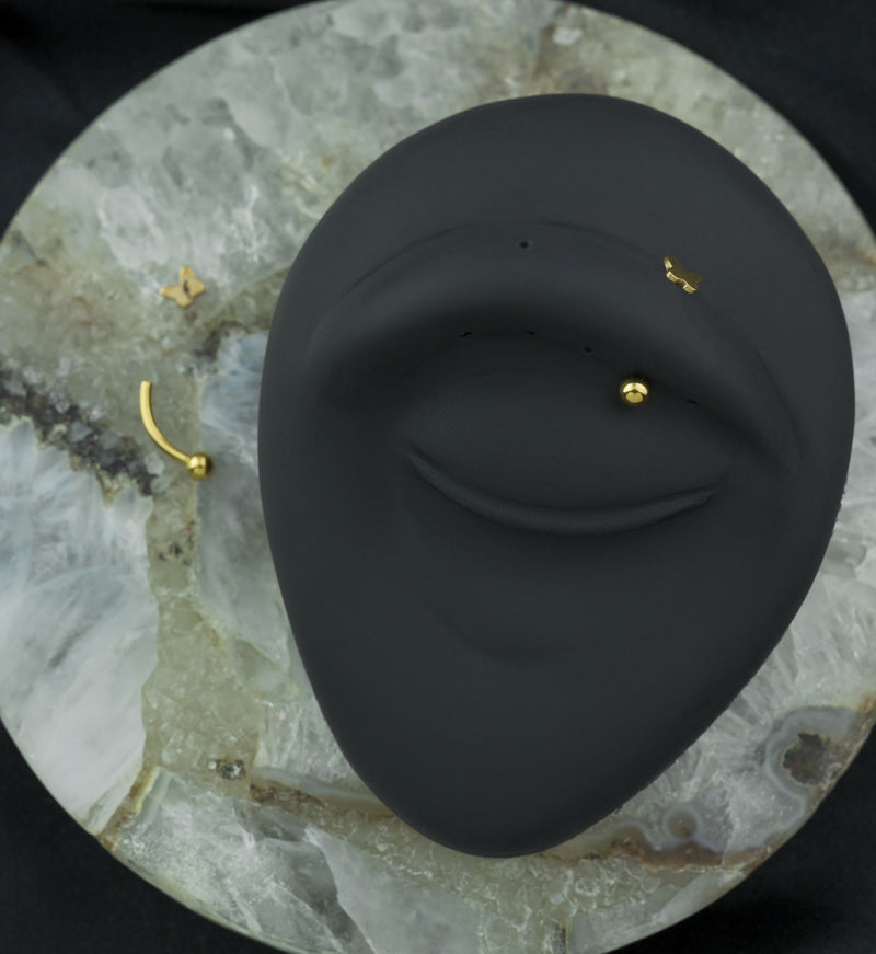 Golden, curved barbells decorated with a bubble butterfly design on top. The top piece has a threadless design that makes it easy to put in and remove. The top design measures 4mm. Made from gold pvd on ASTM F-136 titanium with a 16G size and an inner length of 5/16" (8mm). Complete with a threadless 3mm ball on the end. Sold individually. Fun adornment for rook piercings!