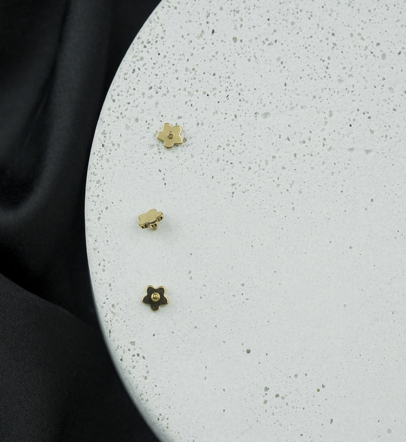 Internally threaded top piece that has a flower design that has rounded edges. Created from gold pvd on ASTM F-136 titanium. Choose your size between 16G with M0.9 threading and 14G with M1.2 threading. The top design measures around 4mm. Cute top piece for your cartilage or tragus piercing! Sold individually.