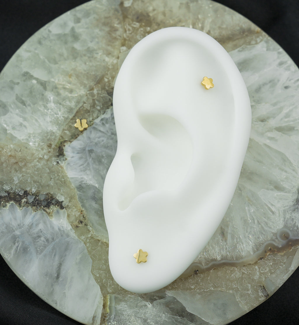 Threadless top piece that has a flower design that has rounded edges. Made from gold pvd on ASTM F-136 titanium. The top design measures 4mm. Amazing top piece for your cartilage or tragus piercing! Sold individually (top only).
