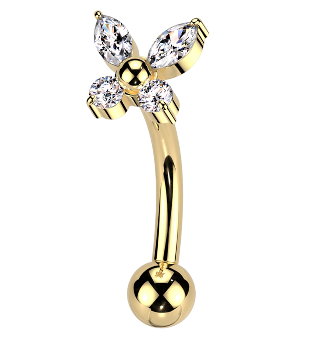 Golden, curved barbells decorated with a butterfly design on top that is filled with marquise, clear cz gems. The top piece has a threadless design that makes it easy to put in and remove. The top design measures 6mm x 5mm. Made from gold pvd on ASTM F-136 titanium with an inner length of 5/16" (8mm) and a 16G size. Complete with a 3mm ball. Sold individually. Fun jewelry piece for your eyebrow or rook piercings!