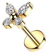 Made from gold pvd on ASTM F-136 titanium, this titanium threadless labret has a butterfly design with the wings being clear cz marquise and round gems. In the middle is a titanium bead. The design measures at 6mm x 5mm. It is made from gold pvd on ASTM F-136 titanium and has a 25G pin and a 4mm flat back. Sold individually, it is available in size 20G with a 1/4" (6mm) wearable length. Golden labret piece for cartilage piercings!