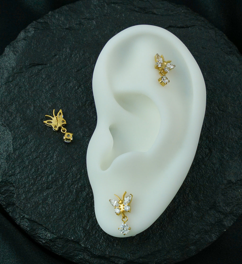 Add a touch of whimsy to your piercings with our Gold PVD Butterfly Clear CZ Dangle Titanium Threadless Top. The 13mm x 8mm design features sparkling clear CZ gems and is made with 25G pin. Sold individually, it's perfect for cartilage or tragus piercings.