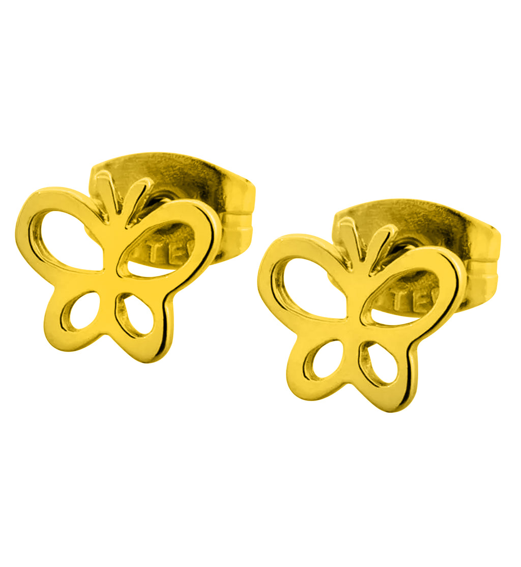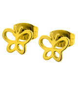 Golden, stud earrings with a butterfly outline design on top. Made with gold pvd on 316L stainless steel. Size is 20G with a wearable area of 1/4" (6mm). Each piece has a stud design with a butterfly back. Design measures about 8mm x 7mm. Sold in pairs (2pcs).