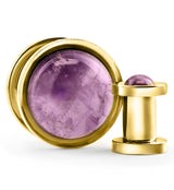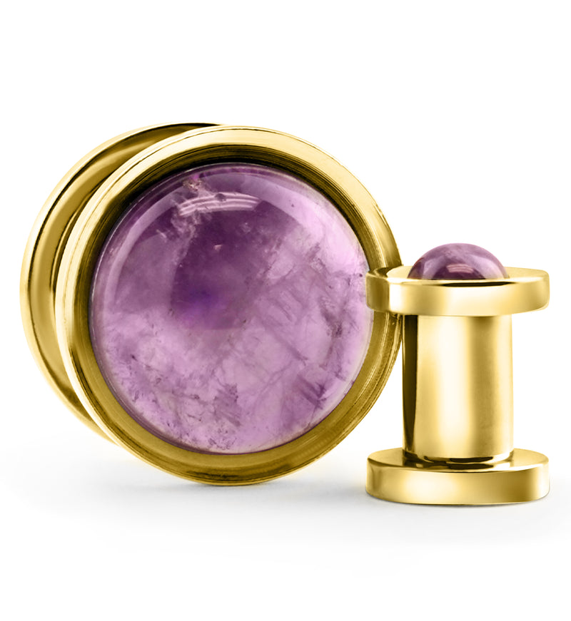 Gold PVD Cabochon Amethyst Stainless Steel Screw Back Tunnel Plugs