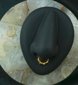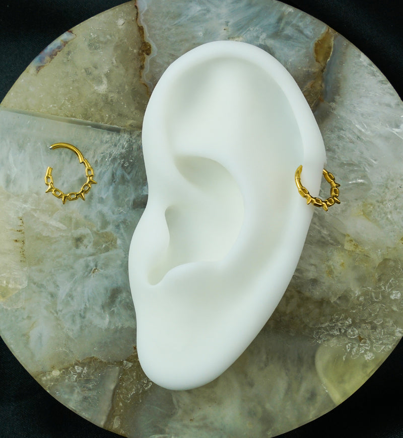 The hinged segment on this ring makes opening and closing a breeze, perfect for septum piercings. Made from 316L stainless steel with a gold PVD finish, these rings are sold individually and are available in a size 16G with an inner diameter of 5/16" (8mm). Ideal for healed piercings.