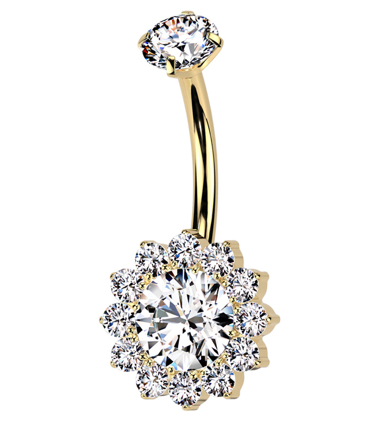 Gold PVD Clear CZ Bold Flower Titanium Internally Threaded Belly Button Ring