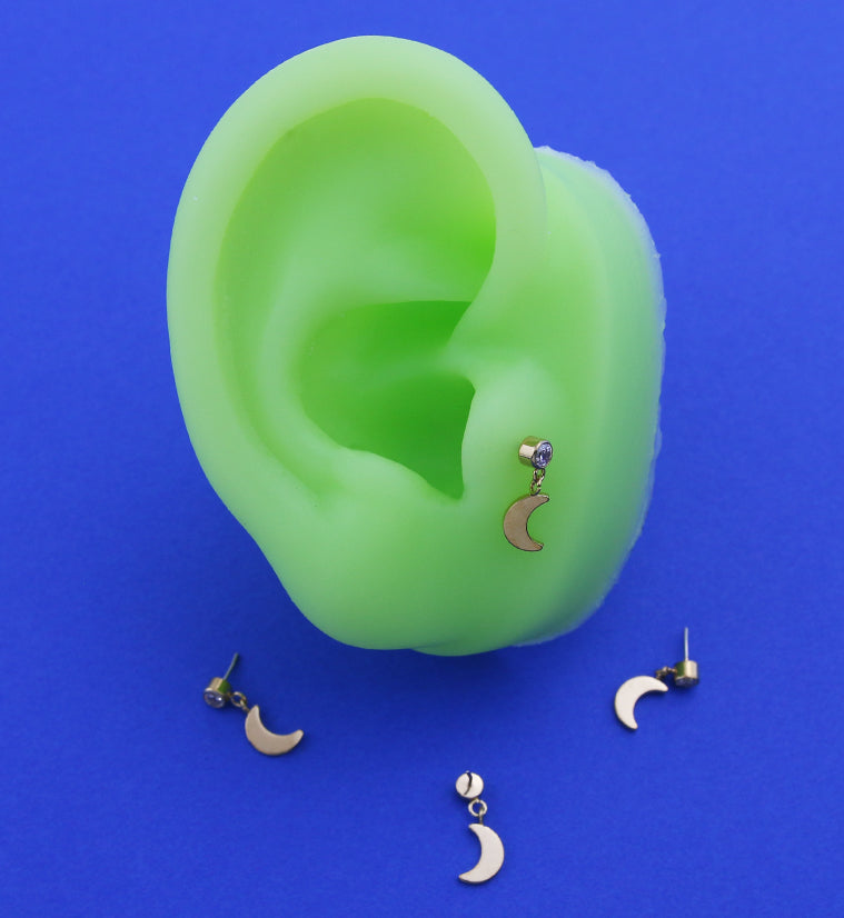 This titanium top is sold individually and made from the gold pvd on ASTM F-136 titanium with a bezel set 2mm clear cz gem with a dangling crescent moon attached. Moon measures about 6mm x 4mm in size. Top is designed to fit most threadless posts with a 25G pin. Fun style to add to your piercing!